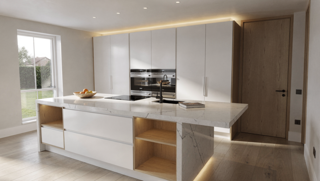 En cuanto a acabados, se optó por una línea contemporánea y atemporal. Se instaló pavimento porcelánico imitación madera, carpintería lacada en blanco y una cocina con isla central y encimera de cuarzo.